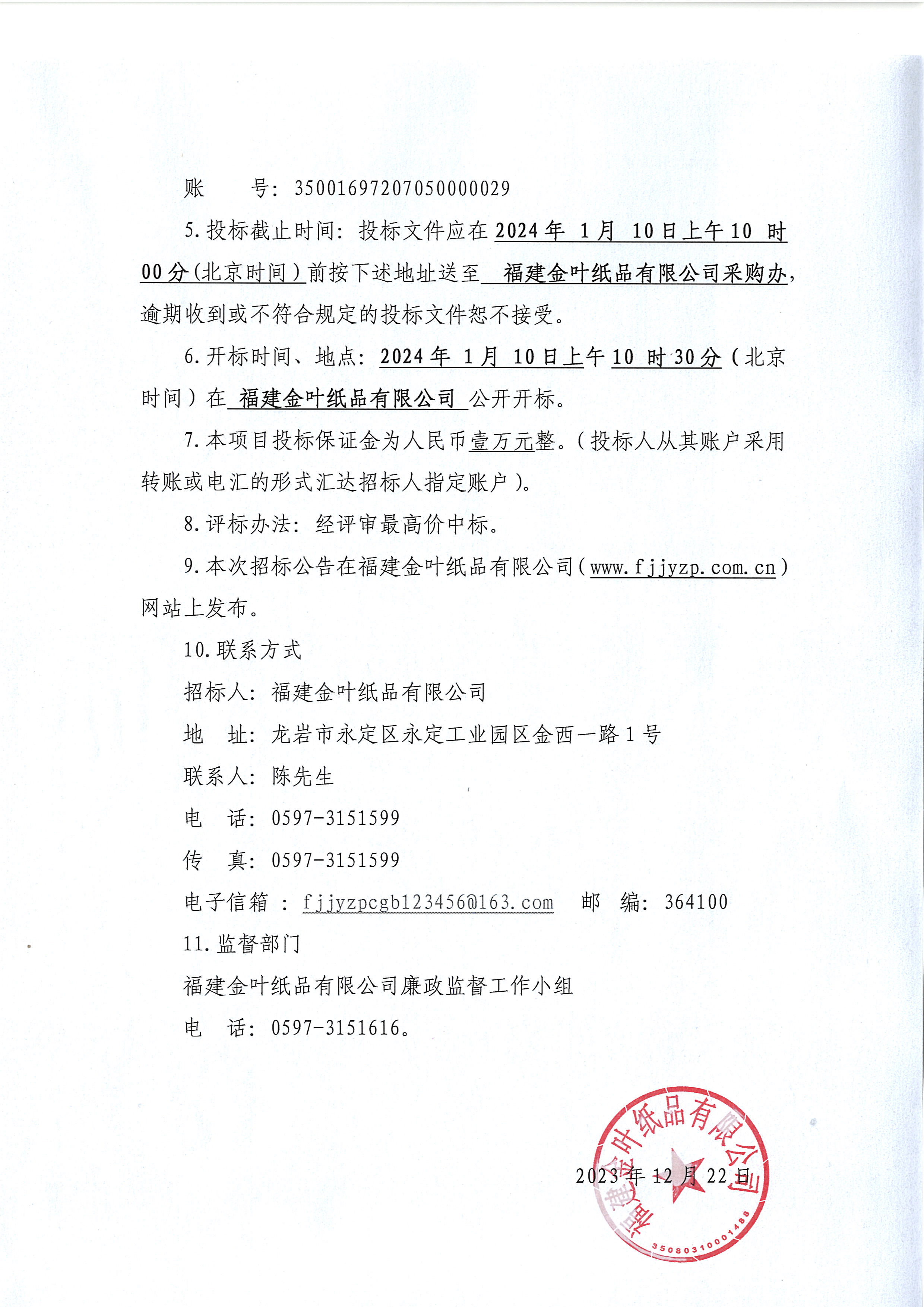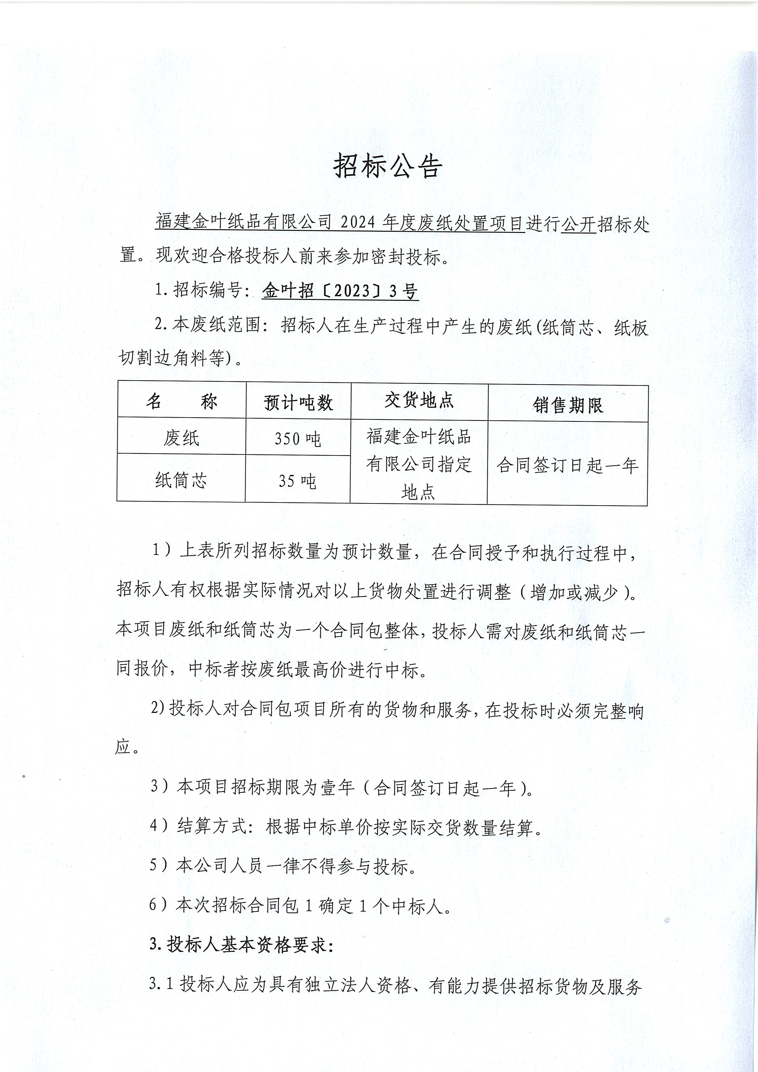 福建金葉紙品有限公司2024年廢紙處置項目